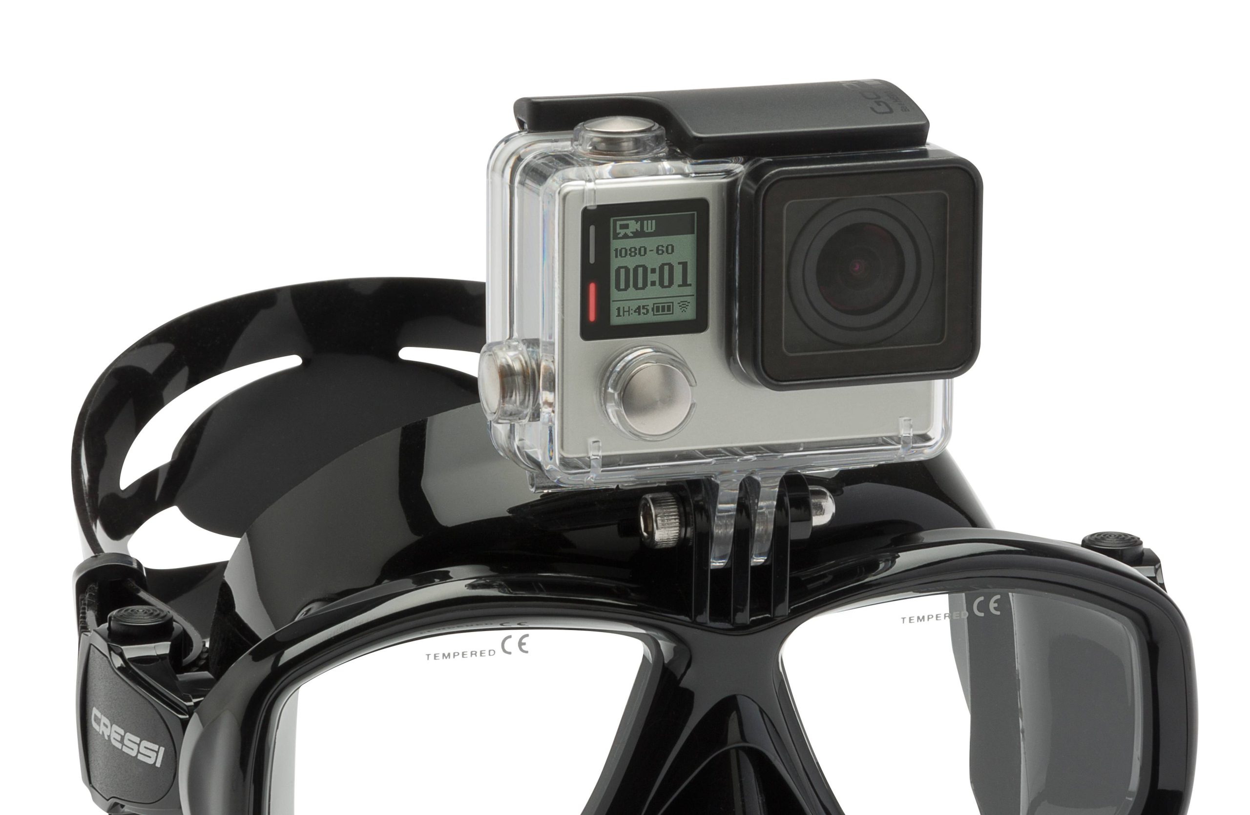 Este modelo de máscara tem o formato da Cressi Focus mas incorpora um adaptador para uma Action Camera. Está disponível em silicone preto e transparente. Vem com parafuso para segurar e